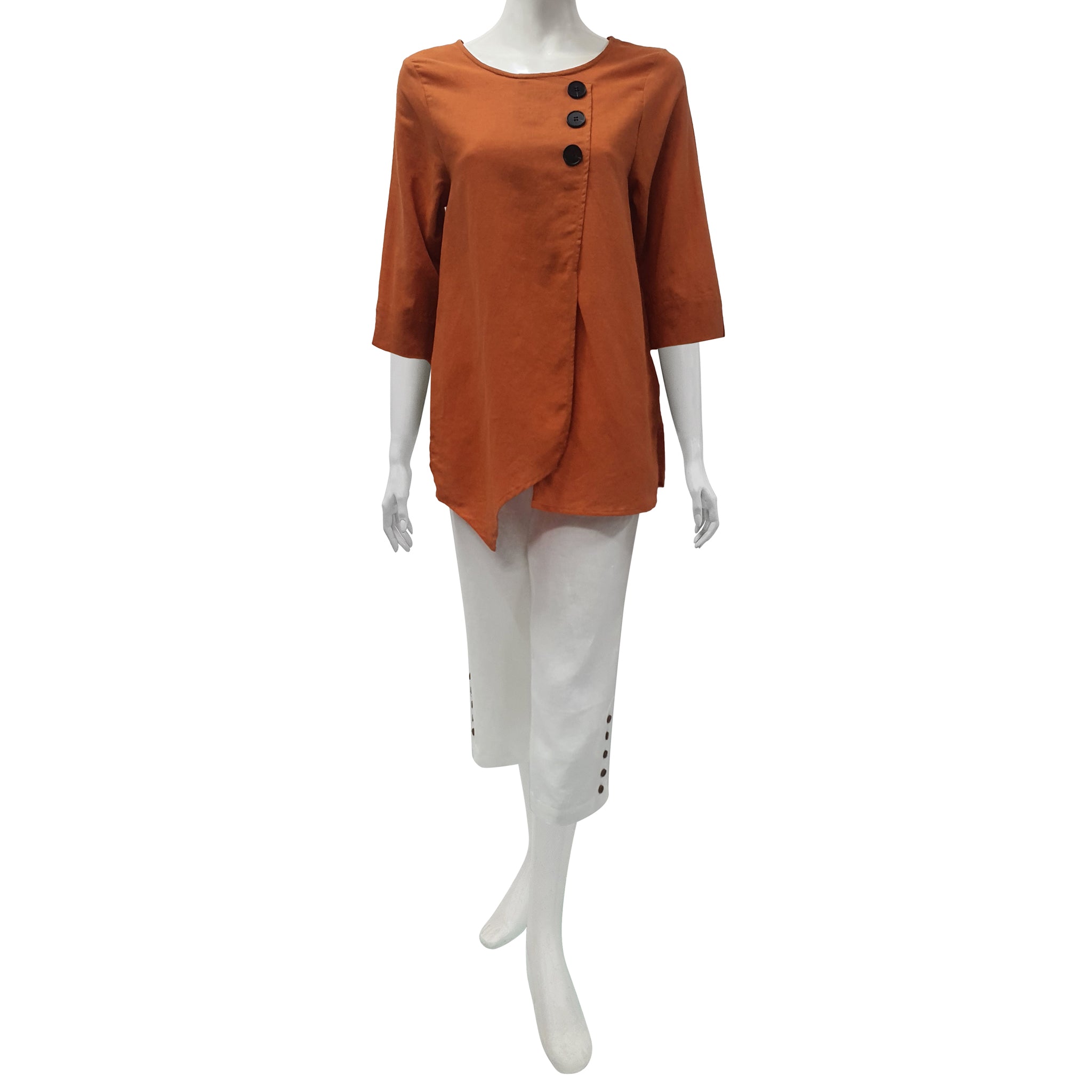 This modern blouse features an asymmetrical front overlay with three bold black buttons near the neckline, 3/4 sleeves and a relaxed fit.
