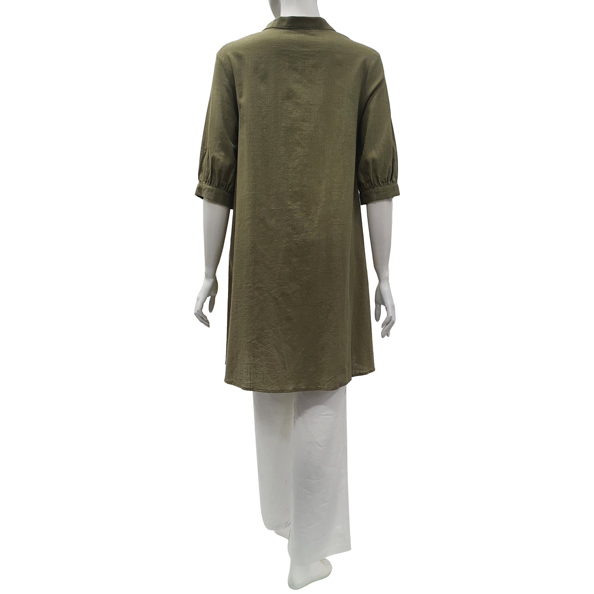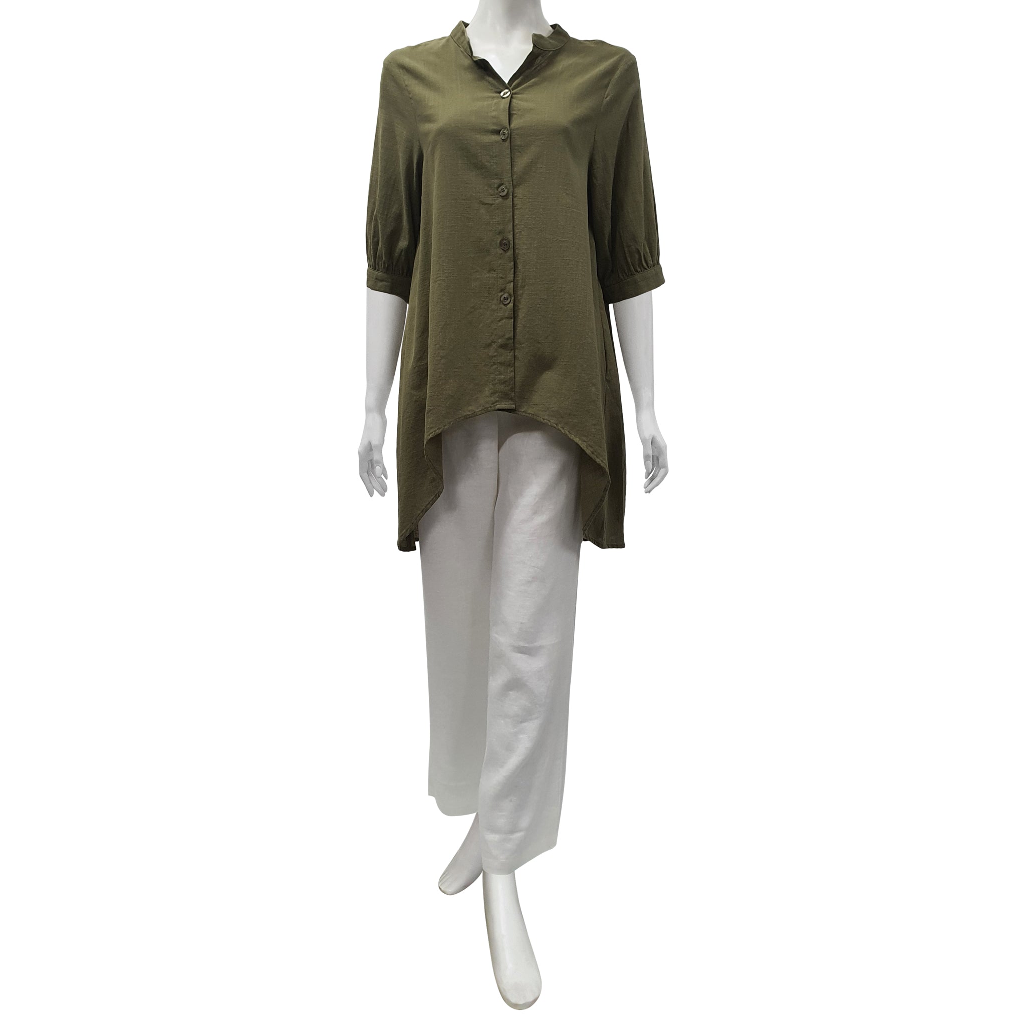 This stylish blouse features a button-up front with a subtle collar and elbow-length sleeves. Designed with a flattering high-low hemline, it offers a relaxed yet polished look, perfect for both casual and semi-formal occasions.