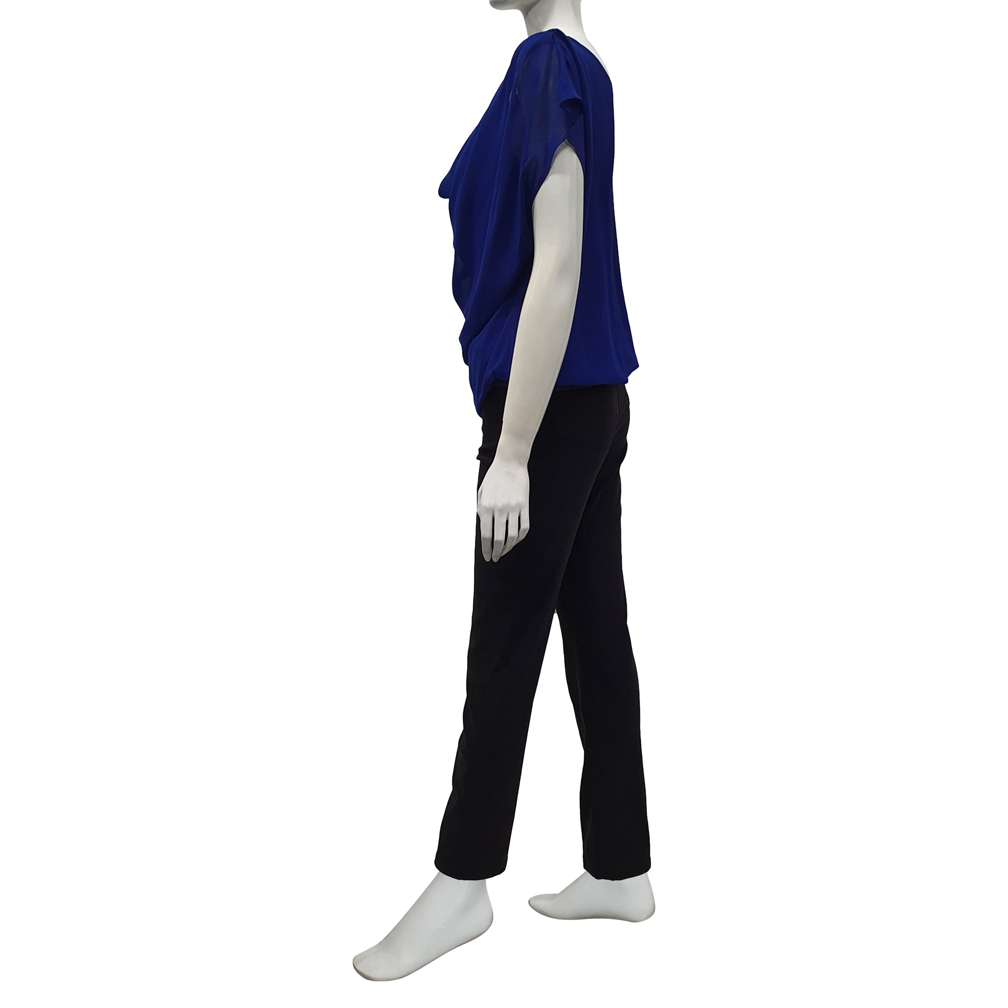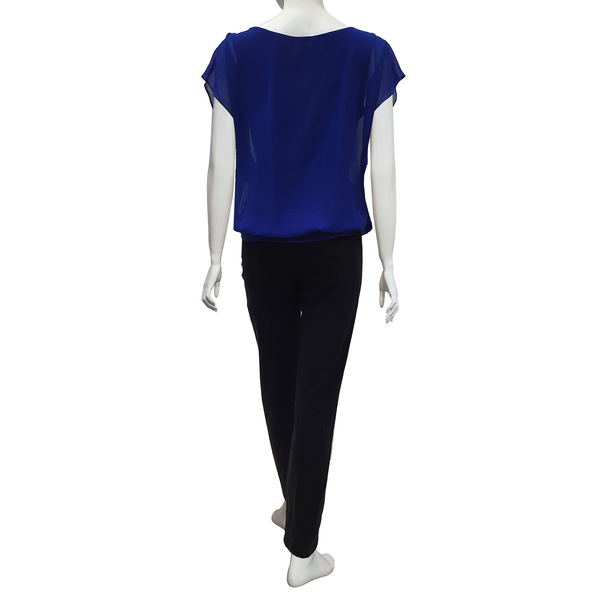 This elegant blouse features a draped cowl neckline and short sleeves. Designed with a slightly stretchable inner layer and a chiffon outer layer finished with an elastic waistband for added comfort and shape. Ideal for semi-formal occasions or polished daywear.
