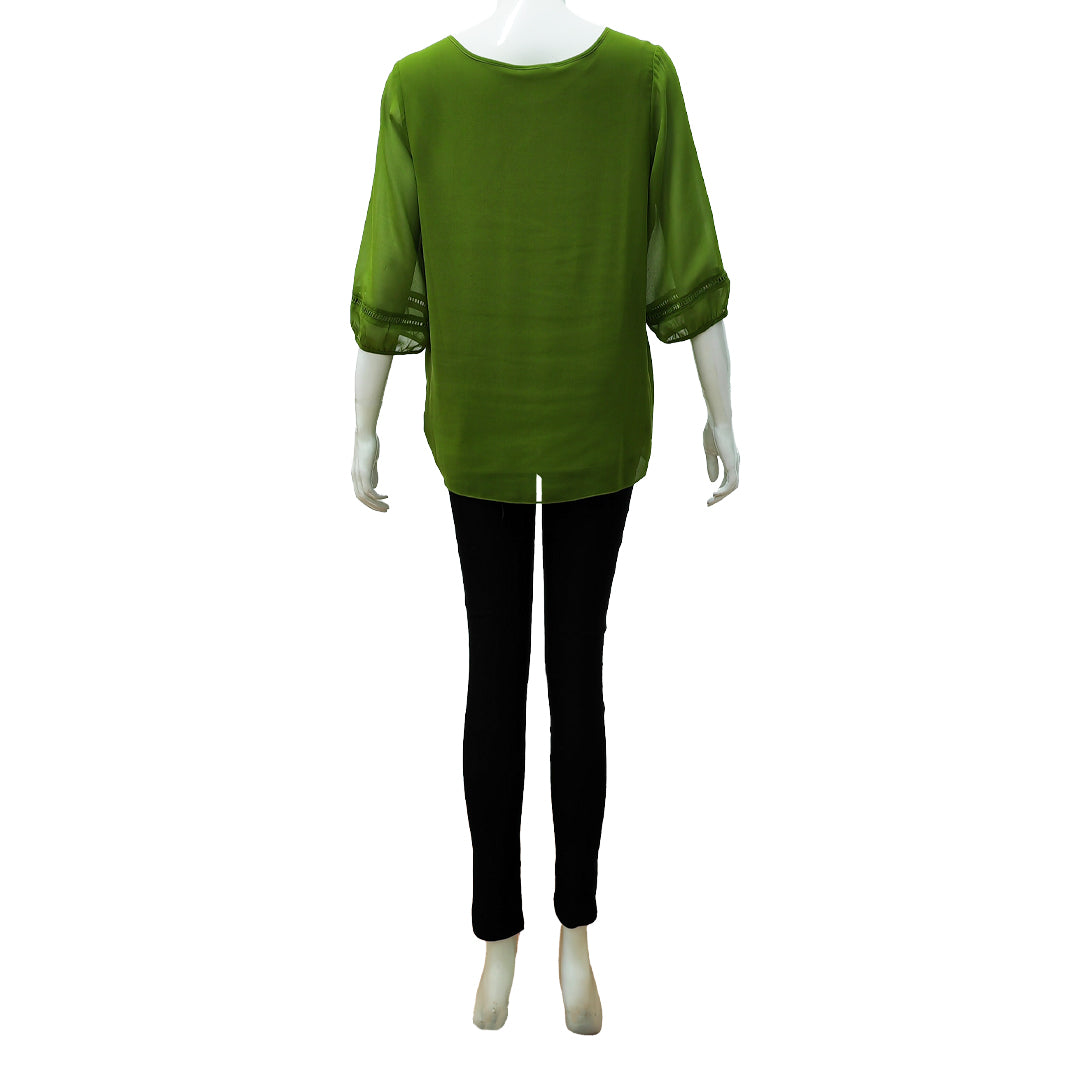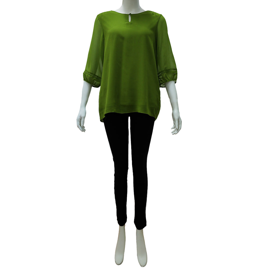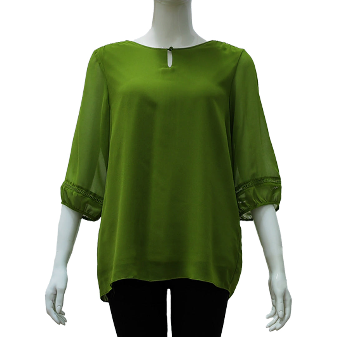A smooth, flowy chiffon blouse. It features a small front keyhole detail and relaxed 3/4 sleeves with subtle lace-trim accents. Lightweight, easy to wear, and perfect for both work and weekend styling.